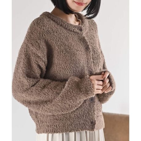 ふわふわの毛足が可愛いフェザーヤーンのニットカーデ。