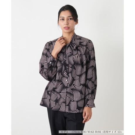 流れるような曲線が織りなす、個性的なプリントが目を引くボウタイブラウスです。とろみのある軽やかな素材感が、ドレープを美しく描き出し、エレガントな雰囲気を演出します。首元にあしらわれたボウタイは、リボン結びにしたり、軽く垂らしたりと、結び方やアレンジ次第で様々な表情を楽しめます。コンパクトな襟と、ボタンで開閉するカフス付きの袖が、きちんとした印象をプラス。一枚で主役になるデザインで、シンプルなボトムスと合わせるだけで、洗練されたコーディネートが完成します。オフィスシーンから華やかなお出かけまで、幅広いシーンで活躍するアイテムです。