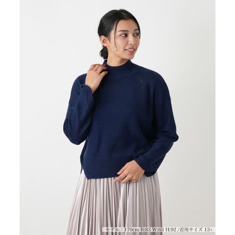 様々な編み地が豊かな表情を見せる、ボトルネックニットです。首元はリブ編みでしっかりと立ち上がり、顔周りをすっきりと見せます。肩から袖にかけては透かし編みが施され、軽やかさと繊細なアクセントをプラス。全体的にゆったりとした身頃と、広めにデザインされた袖が、リラックス感のある着心地と体型カバーを両立します。裾はサイドスリット入りで、前後差のある着丈が動きを演出し、ボトムスとのバランスも取りやすいデザインです。シンプルなボトムスと合わせるだけで、一枚で着映えする上品なカジュアルスタイルが完成します。