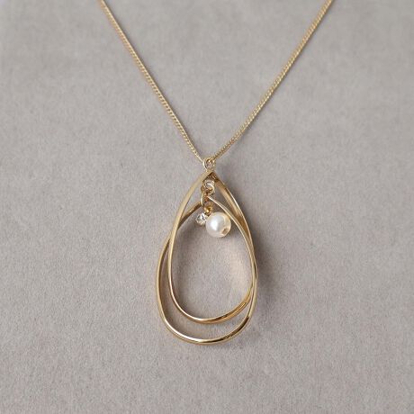上品なティアドロップのリングを重ねたデザインに、パールとラインストーンが煌めく、エレガントなネックレス。