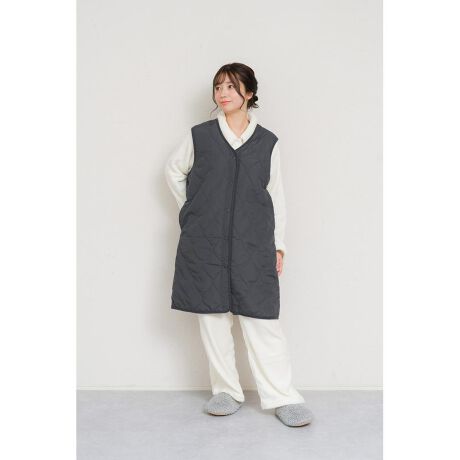 【冬のおうち時間に】寒い季節の強い味方♪あったかキルティングベスト。【体の冷えやすい部位をカバー】背中や腰周りをしっかり覆う嬉しいロング丈◎【裏起毛仕様】薄手なのに着た瞬間からホッとするあたたかさ♪【ベスト型】腕まくりの必要がなく作業もスムーズに進められる!【着脱ラクチン】サッと着脱ができる、前開きスナップボタンで毎日快適〇【ポケット付き】両サイドにはスマホもしまえるポケット付きで、お部屋の移動も快適♪【はっ水加工】水や汚れを弾きやすい加工で家事がしやすい◎