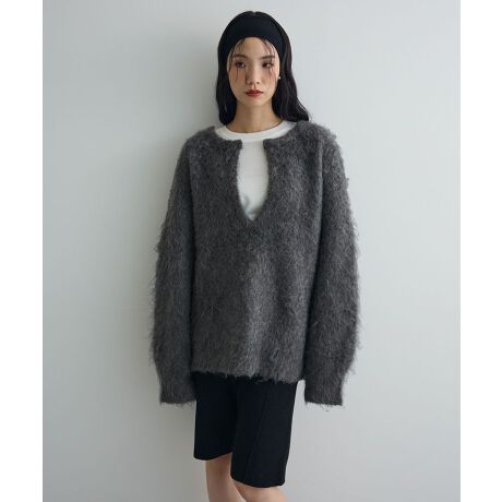 毛足の長いシャギーニット素材で仕立てたシーズナルなニットプルオーバー。ホックで留めるキーネックの首元が抜け感のある着こなしを演出します。前後どちらを前にしても着用いただける2WAY仕様なのも魅力的。タイトなボトムスや旬なハーフパンツを合わせたスタイリングもおすすめです。透け感[なし]