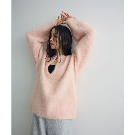 毛足の長いシャギーニット素材で仕立てたシーズナルなニットプルオーバー。ホックで留めるキーネックの首元が抜け感のある着こなしを演出します。前後どちらを前にしても着用いただける2WAY仕様なのも魅力的。タイトなボトムスや旬なハーフパンツを合わせたスタイリングもおすすめです。透け感[なし]