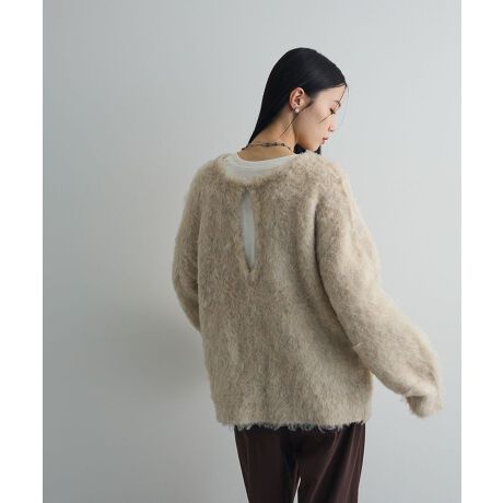 毛足の長いシャギーニット素材で仕立てたシーズナルなニットプルオーバー。ホックで留めるキーネックの首元が抜け感のある着こなしを演出します。前後どちらを前にしても着用いただける2WAY仕様なのも魅力的。タイトなボトムスや旬なハーフパンツを合わせたスタイリングもおすすめです。透け感[なし]