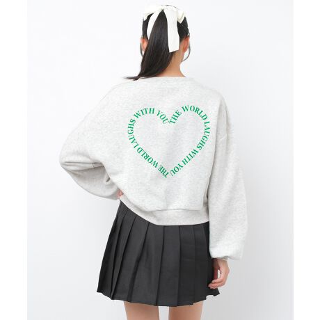 英文字で描かれたハートプリントがアクセントになったトレーナーです。シンプルながらも、韓国風なデザインが目を惹くアイテム。ゆるっと着られるサイズ感なのでミニスカートを合わせて、甘くなりすぎないかわいいスタイルに◎