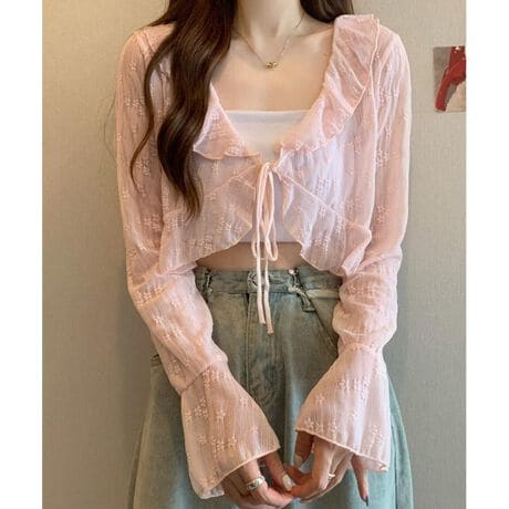 カーディガン レディース ショート丈 通販 シアーカーディガン ボレロ ショートカーディガン カーデガン 羽織もの はおりもの 薄手 長袖 小花柄 フリル トップス 大人 かわいい おしゃれ 女性 top-111 ダイヤモンドハーツ Diamond Hearts