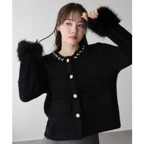 ネックにあしらったビジュー&パールがかわいらしいシャギーニットジャケット。