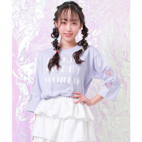 オーガンジーハート七分袖Tシャツ。袖のオーガンジーハート仕様の七分袖Tシャツです。バックのスイート柄ロゴ刺繍がオシャレでcuteな1枚です。七分袖なので春先から初夏まで着用できる1枚です。