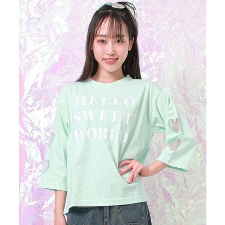 オーガンジーハート七分袖Tシャツ。袖のオーガンジーハート仕様の七分袖Tシャツです。バックのスイート柄ロゴ刺繍がオシャレでcuteな1枚です。七分袖なので春先から初夏まで着用できる1枚です。