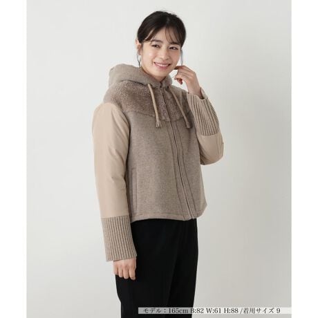 袖、フード周りのボア、そして身頃と、異素材を大胆にドッキングさせたデザインコンシャスなフーデッドジャケット。羽織るだけでコーディネートの主役になる、遊び心あふれる一着です。暖かな中わた入りで厚手の生地を用い、さらに裏地もしっかりと施されており、冬の本格的な寒さから身を守ります。フードは一体型のデザインで、ドローコードを絞ることで顔周りのフィット感を調節可能。便利なポケットも備えており、フロントはジップアップ仕様で着脱もスムーズ。