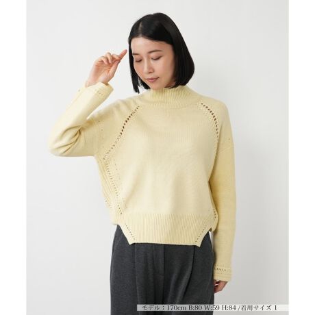 肩線や脇、袖口に施された部分的な透かし編みが、シンプルな中に軽やかな抜け感をプラスするハイネックニットプルオーバー。首元を暖かく包み込むネックラインがシーズンムードを高めます。やや厚手ニットで保温性があり、程よい伸縮性も備えているため、快適な着心地を実現します。裾にはスリットが入っており、着こなしに動きを表現しつつ、ボリュームのあるボトムスともバランスよくコーディネートできます。