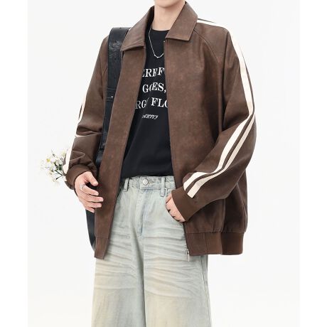 フェイクレザーならではの軽さと扱いやすさを備えた、ヴィンテージ感漂うジャケット。袖に施された2本ラインがスポーティーなアクセントとなり、ストリート感もありかっちりしすぎず着やすいデザイン。程よくゆったりとしたシルエットで、羽織るだけでこなれた印象に仕上がる一枚。