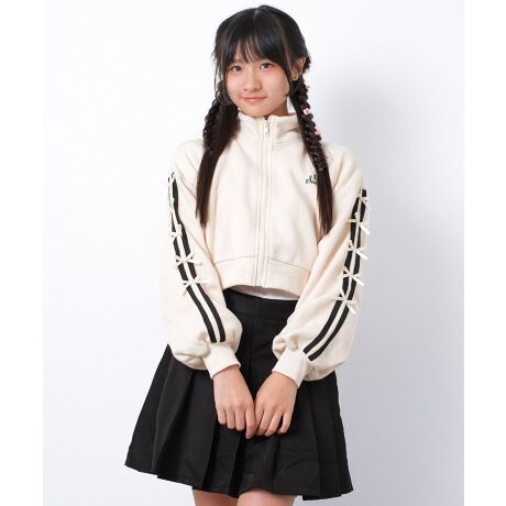 ショート丈にサイドラインをリボン仕様にしたトレンド感満載の裏起毛ジャケットです。ボーイッシュになりがちなトラックジャケットにリボンデザインにすることで女の子らしいアクセントをプラス。ワイドパンツなど、ハイウエストのボトムスと合わせるとバランスのとれたストリートスタイルが完成します◎