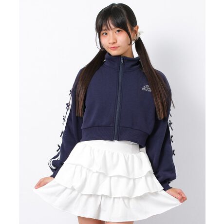 ショート丈にサイドラインをリボン仕様にしたトレンド感満載の裏起毛ジャケットです。ボーイッシュになりがちなトラックジャケットにリボンデザインにすることで女の子らしいアクセントをプラス。ワイドパンツなど、ハイウエストのボトムスと合わせるとバランスのとれたストリートスタイルが完成します◎