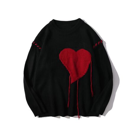 目を惹く大きなハートとその周囲を大胆にステッチした個性的なスウェット風ニット