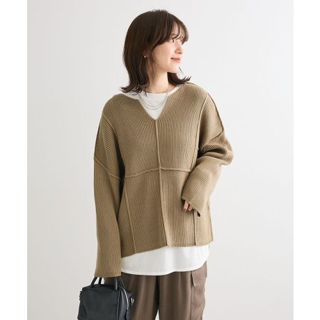 リンキングの切り替えデザインがこなれ感たっぷりなニットプルオーバー。ワイドな身幅のゆったりシルエットながら、Vネックがすっきりとした顔まわりを演出します。着回しやすいベーシックなカラー展開にも注目。スラックスやスカートなど合わせるボトムを選ばず、デイリーに活躍してくれるおすすめのアイテムです。透け感[なし]