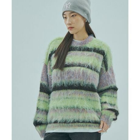 毛足のある糸で編み立てた存在感のあるボーダーニット