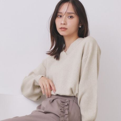 ウール混の片畦Vネックボクシーパフニット