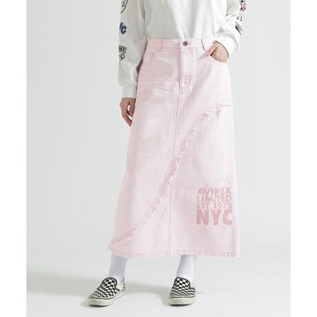 ・フリンジやワッペン,プリントがアクセントになったデニムスカート・ストレートラインで、スタイリングしやすいシルエット・同シリーズのデニムジャケット(品番:7836152601)とのセットアップもおススメ【AVIREX WOMAN】本格的なミリタリーウェアが持つ機能性とデザインをレディースカジュアルに投影したライン。個性的かつ時代性のあるレディースブランドとして聡明、自由、好奇心、凛として快活な働く大人の女性へ向けたレディスカジュアルを提案しています。