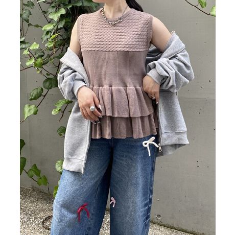 [型番:PL0252]◆新感覚のノースリーブニット◆肩から胸あたりまでケーブル編みを横向きに使い、ウエストはリブで絞めています。裾はフリルで広がり、女性らしいシルエットを作ります。リボンブラウスなどを合わせて甘々に仕上げてもよし、デニムと合わせてよりカジュアルにしてもよし。レイヤードスタイルの幅を利かせる一着です。model tall:158cm