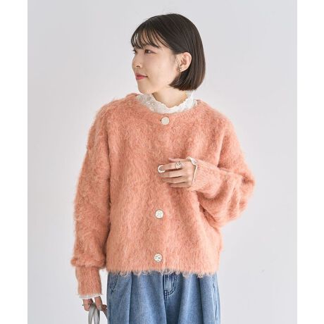 秋 冬 カーディガン シャギー 起毛ニット モヘアタッチ ショート丈 クロップド丈 ボリュームスリーブ メタルボタン 羽織り 着回し スタイルアップ 長袖 レディース