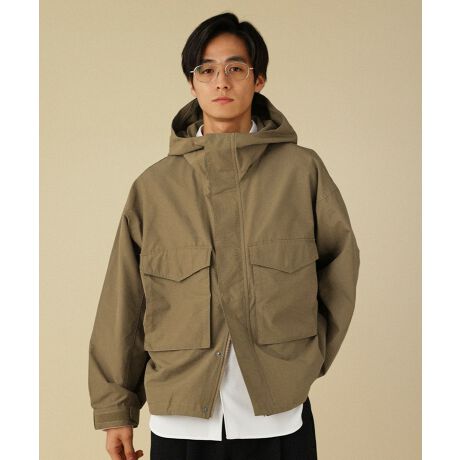 フード一体型のネックは首回りを覆って格好良く決まるハイネックデザインを採用。フロントのファスナーは上下どちらからも開閉可能なダブルジップなので、下だけ開けてインナーを見せるレイヤードスタイルなども可能に。着こなしの幅が広がるディテールです。風の入り込みを防ぐためにファスナーの上からさらにボタン留めできる仕様にし、裾を絞ることができるドローコードも仕込みました。