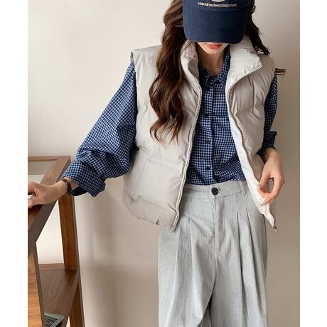 大人っぽくて上品なコーデが決まる、軽くて暖かいダウン風中綿ベスト。