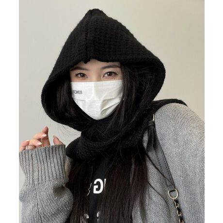 フードとマフラーが一体化したデザインのニットフードマフラー。