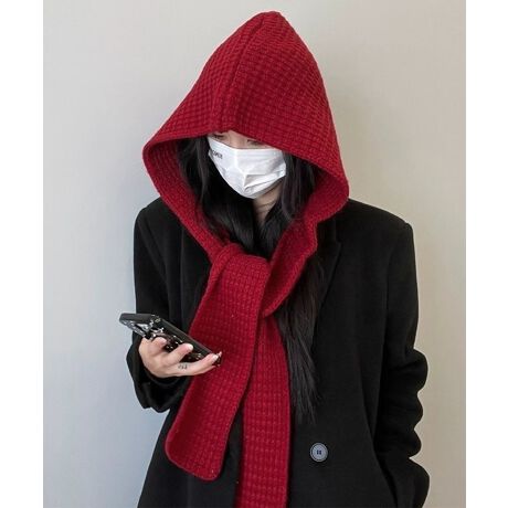 フードとマフラーが一体化したデザインのニットフードマフラー。