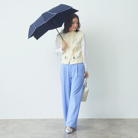 ○傘生地には防水撥水加工を施し、縫製には撥水糸を使用していますが、激しい雨や長時間のご使用では雨が染み込むことがございます。また飾り加工部分(刺繍、ステッチ、パイピング、テープ等)はデザインの特性上、完全な防水撥水加工が難しい場合があり雨が染みやすいのでご注意下さい。