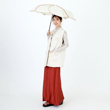 ○傘生地には防水撥水加工を施し、縫製には撥水糸を使用していますが、激しい雨や長時間のご使用では雨が染み込むことがございます。また飾り加工部分(刺繍、ステッチ、パイピング、テープ等)はデザインの特性上、完全な防水撥水加工が難しい場合があり雨が染みやすいのでご注意下さい。