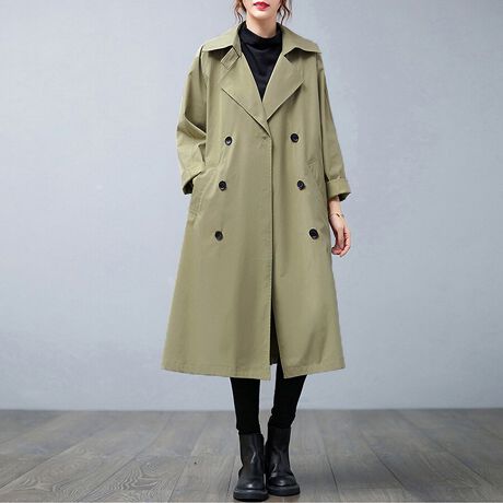 ダブルボタンとロング丈が上品な印象を与える、トレンチコートです。