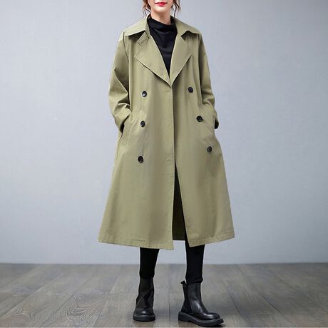 ダブルボタンとロング丈が上品な印象を与える、トレンチコートです。