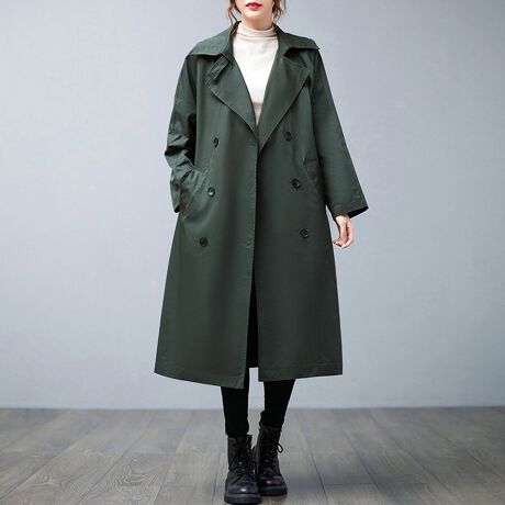 ダブルボタンとロング丈が上品な印象を与える、トレンチコートです。