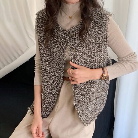 クラシカルなツイード素材に、フリンジディテールを施したノーカラーベスト。