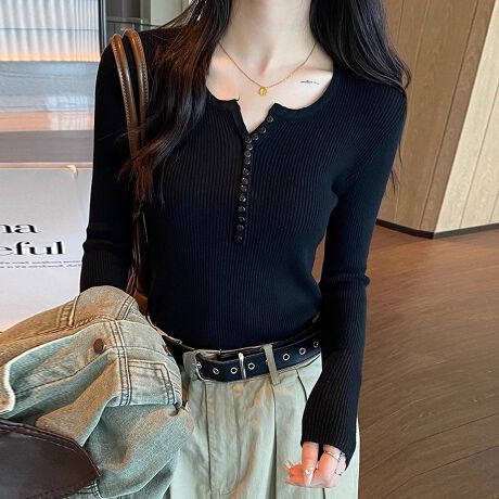 ボタン付きネックが抜け感を演出する、リブ素材の長袖トップス。
