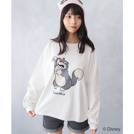 「シンデレラ」に登場するトレメイン夫人のペットのいじわるな猫「ルシファー」を大胆にフロントにプリントしたロングTシャツ。程よいルーズ感のあるシルエットとなっております。