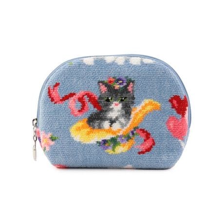 『モンプティシャ』のポーチです。愛くるしい表情で子猫たちが楽しそうに遊ぶ姿に心が和みます。内側にはリップホルダーを4つあしらい、定位置が決められてさっと取り出せる便利な仕様に。口が大きく開いて中身が取り出しやすいラウンドファスナーの開口部もうれしいポイント。コスメなど、毎日持ち歩く細かなものを収納するのにぴったりなアイテムです。