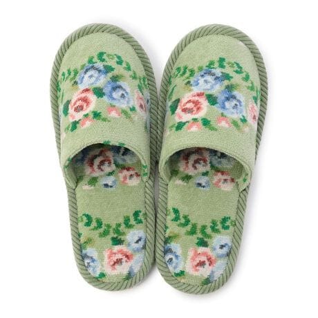 足裏や甲に当たる部分もシュニール織で仕立てた『ノスタルジックノート』のスリッパです。素足でもべたつきにくく、履きやすいのがポイント。やわらかくフィットしつつ足冷え防止にも役立ちます。ご自身用としても、来客用に揃えておくのにもおすすめです。