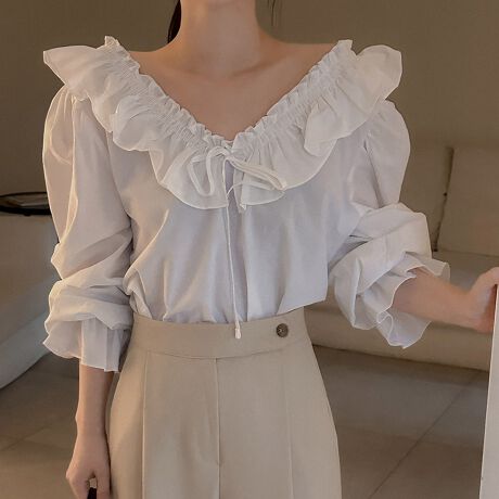フリルネックとボリュームスリーブが印象的な長袖ブラウス。