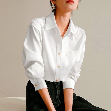 ゴールドボタンがアクセントの長袖ホワイトシャツです。