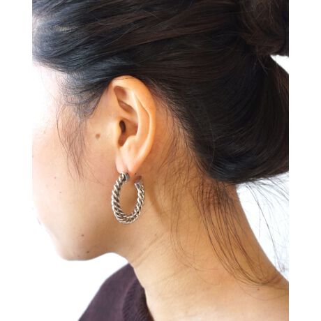 細かなツイストを重ねたロープ調のシルバーフープピアス。立体的なねじりが角度ごとに陰影を生み、耳もとで品よく存在感を放ちます。ほどよいボリュームながら表情は軽やか。熟練の職人によるハンドメイドなので軽い着け心地です。