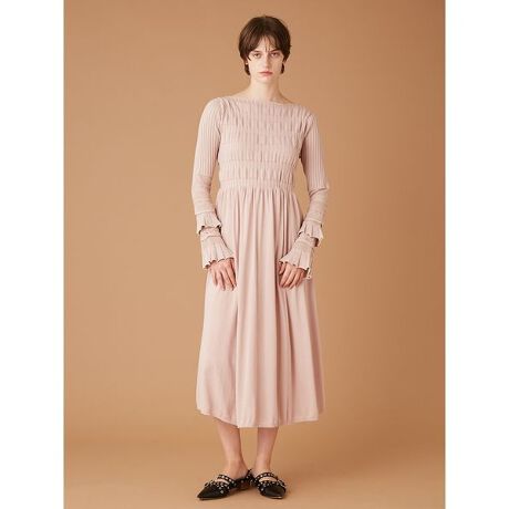 RWNO251029バイカラーリボンニットドレスと同型のボディを使用し、袖のデザインを一新。様々な編み地を組み合わせた立体的なレースとフリルが特徴で、ニット技術を駆使した工夫ある袖に仕上げました。コンパクトなトップとふんわり広がるスカートのバランスが魅力。フリルの端にはさりげない配色ラインをあしらい、アクセントを添えています。