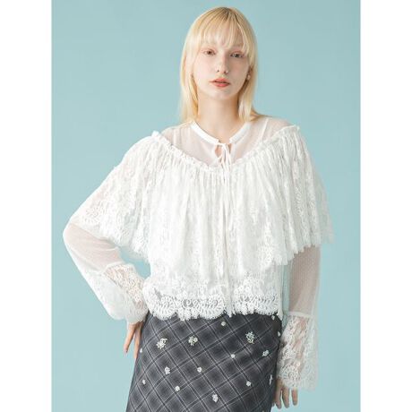 スカラップレースとドットチュールを組み合わせた、ケープ風フリルが目を引くトレンド感あるブラウス。ボヘミアンな雰囲気が漂う一着です。ネックは共地リボンと、小さな釦をあしらい繊細な印象に。今季はデニムやレザーのボトムスとのコーディネートがおすすめです。