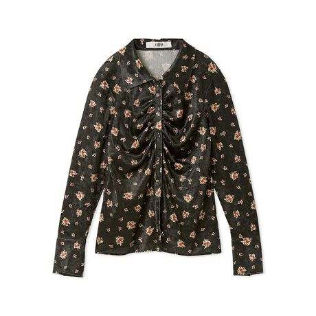 オリジナルの花柄プリントを施したコンパクトなシャツ。やや伸縮性のある素材を使用し、軽やかな着心地に。前立てにはギャザーを入れて立体感をプラス。あえて一番下までボタンを付けないデザインにし、ボトムスがのぞくレイヤードスタイルを楽しめる一着です。