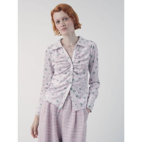 オリジナルの花柄プリントを施したコンパクトなシャツ。やや伸縮性のある素材を使用し、軽やかな着心地に。前立てにはギャザーを入れて立体感をプラス。あえて一番下までボタンを付けないデザインにし、ボトムスがのぞくレイヤードスタイルを楽しめる一着です。