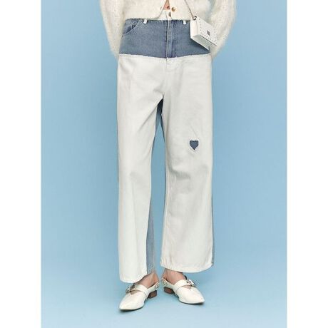 くたっとしたワイドシルエットがかわいいデニムパンツです。ウエストのベルト、前後身頃、高め位置での切替えで生地の裏表を変えた、リメイク風のモードなデザインになっています。さり気なく左前膝と後ろ右ポケットにハートのアップリケを入れて、フェミニンにも着用いただけるデザインに落とし込みました。