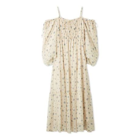 オリジナルの花柄プリントが映えるロング丈ワンピース。シアー感のあるシフォン素材にラメ糸を織り込み、華やかさを演出。袖山は肩に乗せてもオフショルダーでも着られる2way仕様で、パフスリーブの袖口にはゴム入り。ギャザーたっぷりの身頃と、コルセット風の切替デザインがポイントです。ウエストや背中はゴム仕様で快適な着心地です。