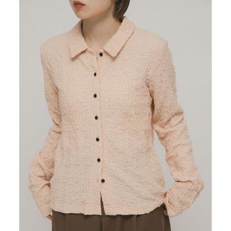 ポコポコとした素材感がポイントになったカットソーシャツ。程よくフィット感のあるサイジングで、裾の釦を開けて着ていただくと自然と抜け感が演出できます。ボリュームのあるボトムやコクーンパンツと相性良く合わせていただけます。