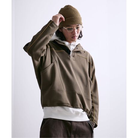 フットボールジャージを再構築した、遊び心溢れるスタンドカラースウェット。